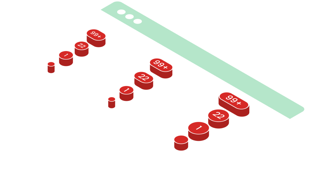 Hint components come in different variants to convey notification counts effectively: the dot variant is used to indicate new content or actions without specifying a number, often represented as a small circle. The 1 digit variant displays a single number (e.g., "1") to show a small count of items or notifications. The 2 digits variant is used for counts up to 99 (e.g., "12"), providing more detail without overwhelming the user. For counts exceeding 99, the 99+ variant simplifies the display to "99+" to indicate a large number of items or notifications, maintaining a clean and clear interface.
