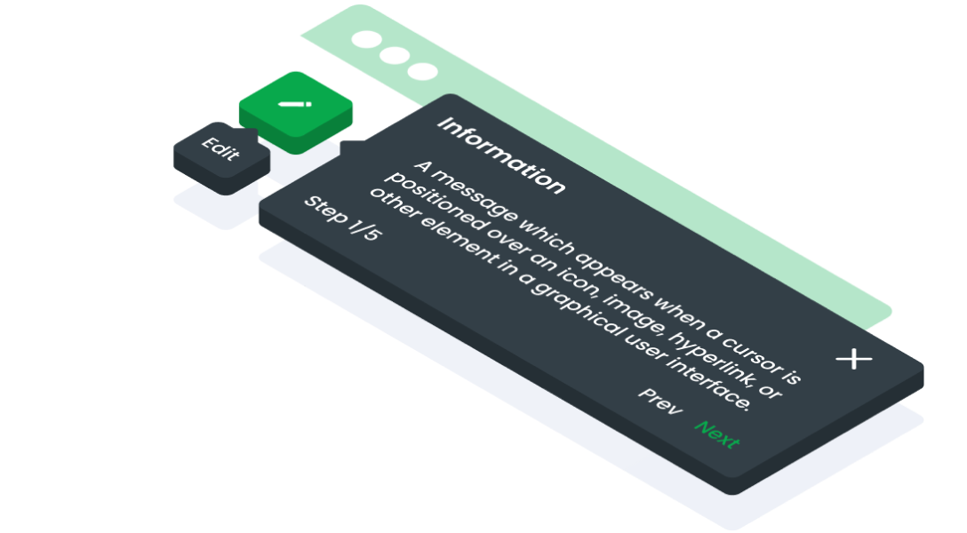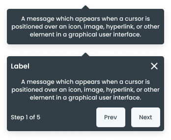 - Used to add context to a given screen. For example, tooltips can be used to explain the function of icons or other UI elements that may not be immediately clear to users (offer hints or additional guidance to users).