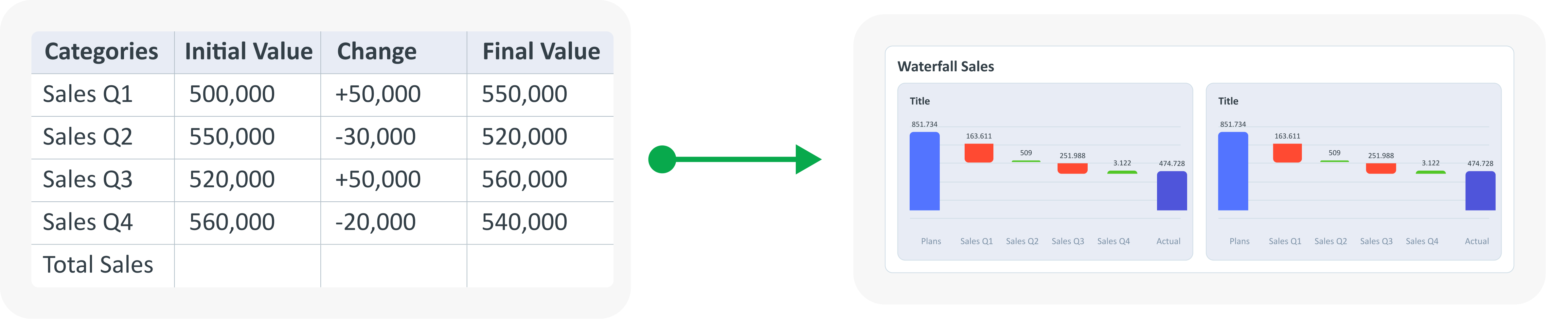 - Cumulative Totals: Display cumulative totals at each step to show each segment's contribution to the final value.