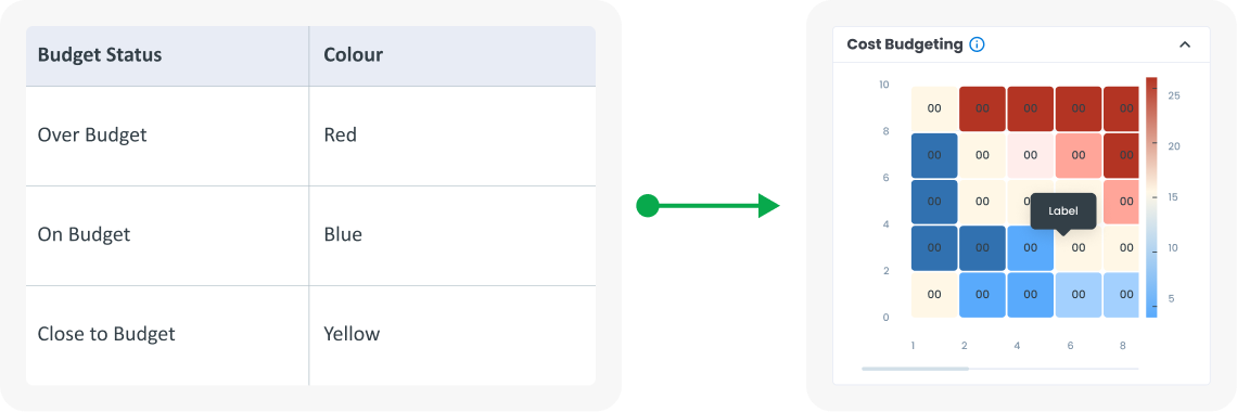 - Use color coding to visualize value status: red for over budget , green for on budget, yellow for threshold border.​