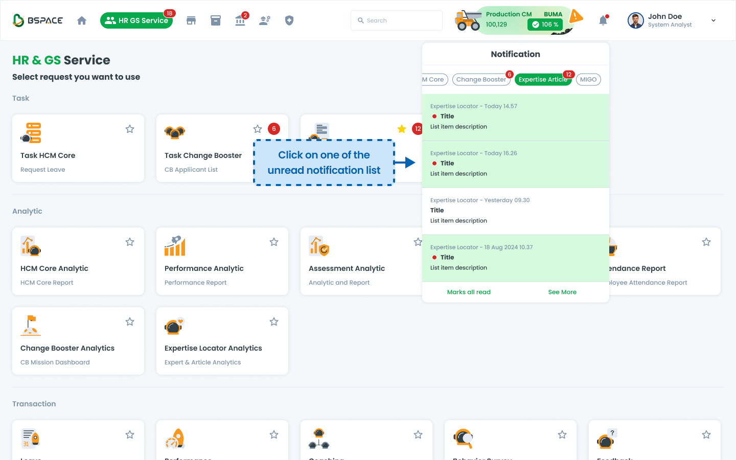 Notifications are categorized based on different available features (e.g., HCM Core, Change Booster, Expertise Article, etc.).