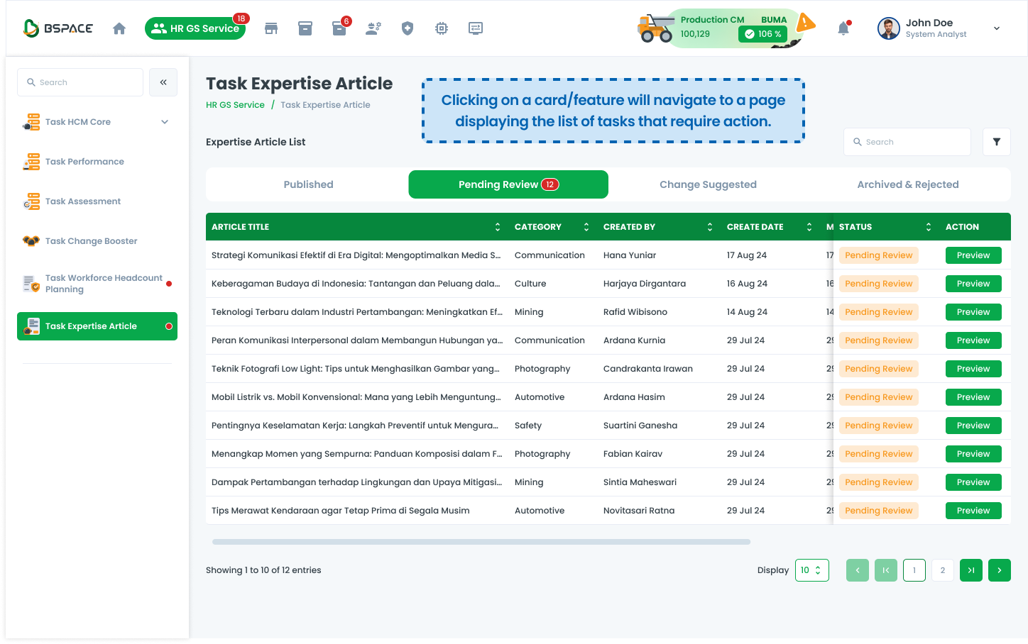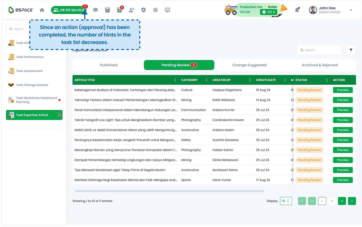Clicking a task opens the detailed task list for review and approval.