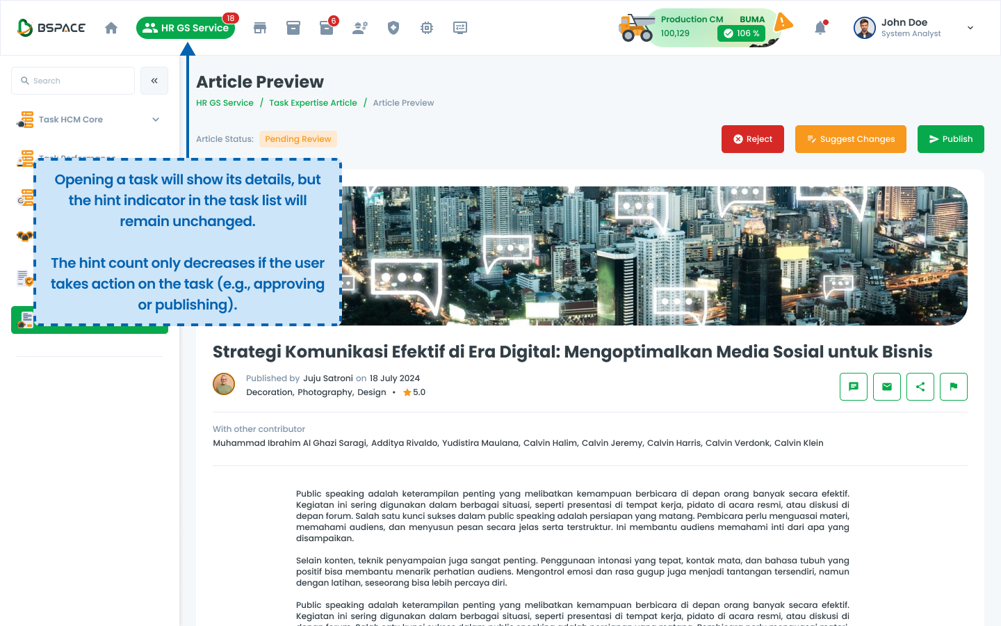 Opening an article task moves it from the pending list to an updated status.