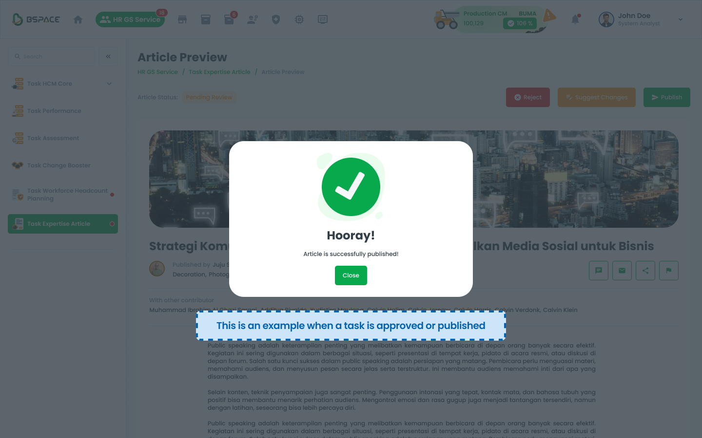 When a task is approved, a success confirmation appears.